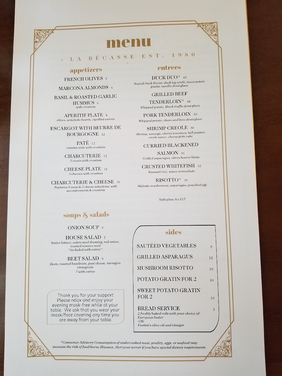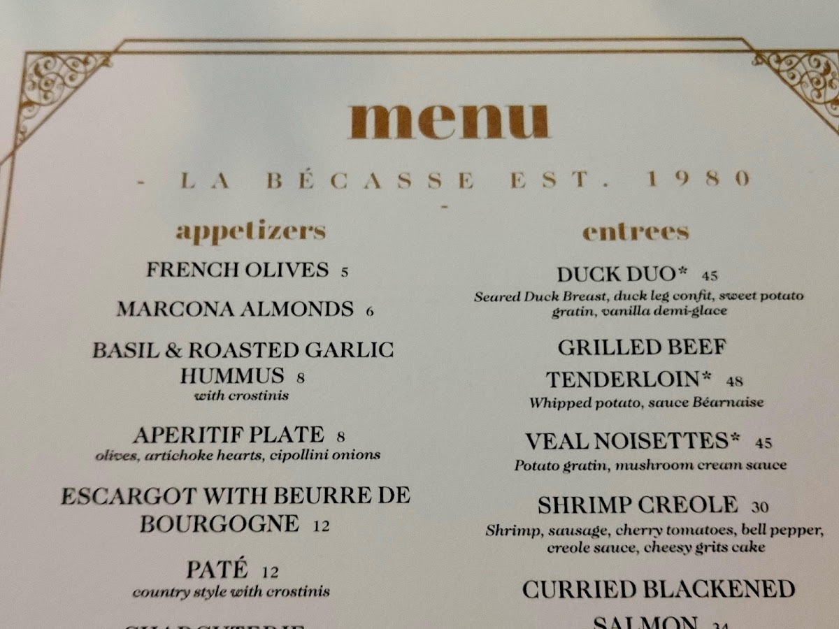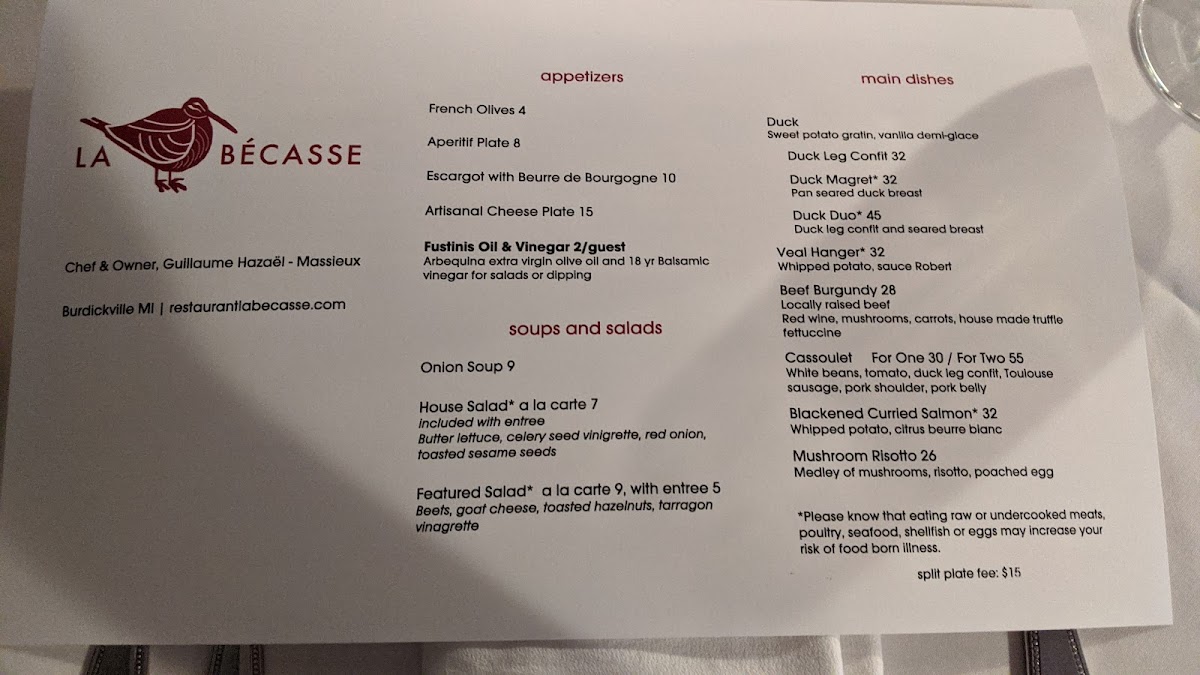 Welcome to La Becasse Restaurant, a hidden gem nestled in Maple City, Michigan. This elegant yet inviting French country eatery offers a culinary adventure that celebrates classic cuisine with a personal twist. The menu features enticing entrees like Beef Burgundy and Blackened Curry Salmon, alongside delectable main dishes such as Duck Leg Confit and Veal Hanger. Each dish is thoughtfully crafted to highlight fresh flavors and exquisite presentation.