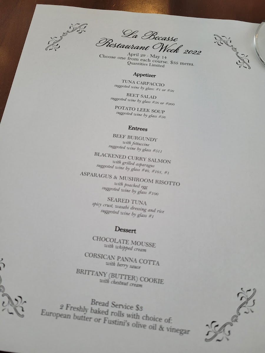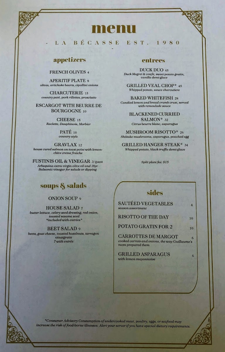 Beyond the food, the ambiance is enchanting, with soft lighting and tasteful decor that sets the perfect backdrop for a refined dining experience. Customers rave about the welcoming staff, whose knowledge enhances your meal, creating a warm atmosphere that feels like home. Indulge in favorites like the creme brulee or experience the remarkable wine selection that perfectly complements every bite. La Becasse isn’t just a meal; it’s a memorable culinary escape you won't want to miss!